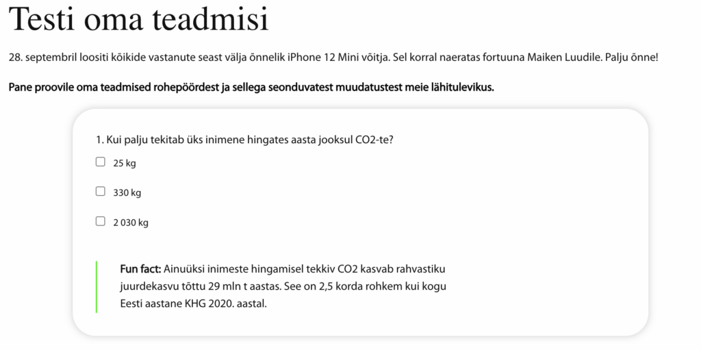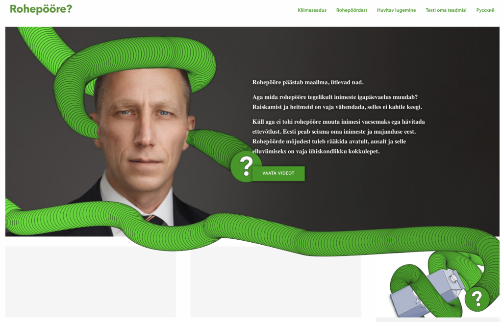 Emotsionaalsete küsimustega kampaania suunas huvilisi ehk isemõtlejaid veebilehele, kus sai lugeda artikleid elektrihinna tõusust, kasvavatest kuludest, kallimast kütusest, sisepõlemismootoritega autode müügi lõppemisest ja liha tarbimise vähendamisest. Isemõtlemise toetamise asemel pakuti seega kallutatud narratiive, mis loovad kindla fooni, et kliimapoliitika seostub eelkõige kaotuse, surve ja piirangutega – „sõda plastile“, „liha tarbimine peab vähenema“, „elektri ja sooja hind tõuseb“ ja muidugi „Eesti vajab rohepöördeks kliimaseadust“.