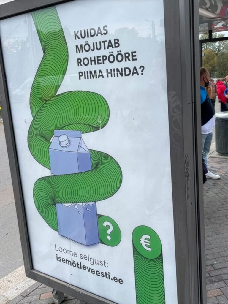 „Kus oled sina?“ oli seega katarsis – tõmbas loori korraks asjadelt, mida püütakse hoida varjatuna. See meenutas aga ka üht toredat seika aastast 2021. Just aasta varem oli EL-is tugevalt kanna kinnitanud Euroopa roheline kokkulepe ning ka Eesti oli otsustanud, et aastaks 2050 peab meie majandus olema kliimaneutraalne. Et debatile hoogu anda, lasi Viru Keemia Grupp (VKG) tassida tänavatele reklaamplakatid, millel kole roheuss inimesi kägistas. Kampaania nimi oli „Isemõtlev Eesti“.
